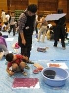 「紫色は何色でつくる?」と内海さんがこどもたちに尋ねると、