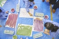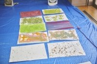 色を混ぜ合わせ、床に敷いた養生シートの上に紙を置き、