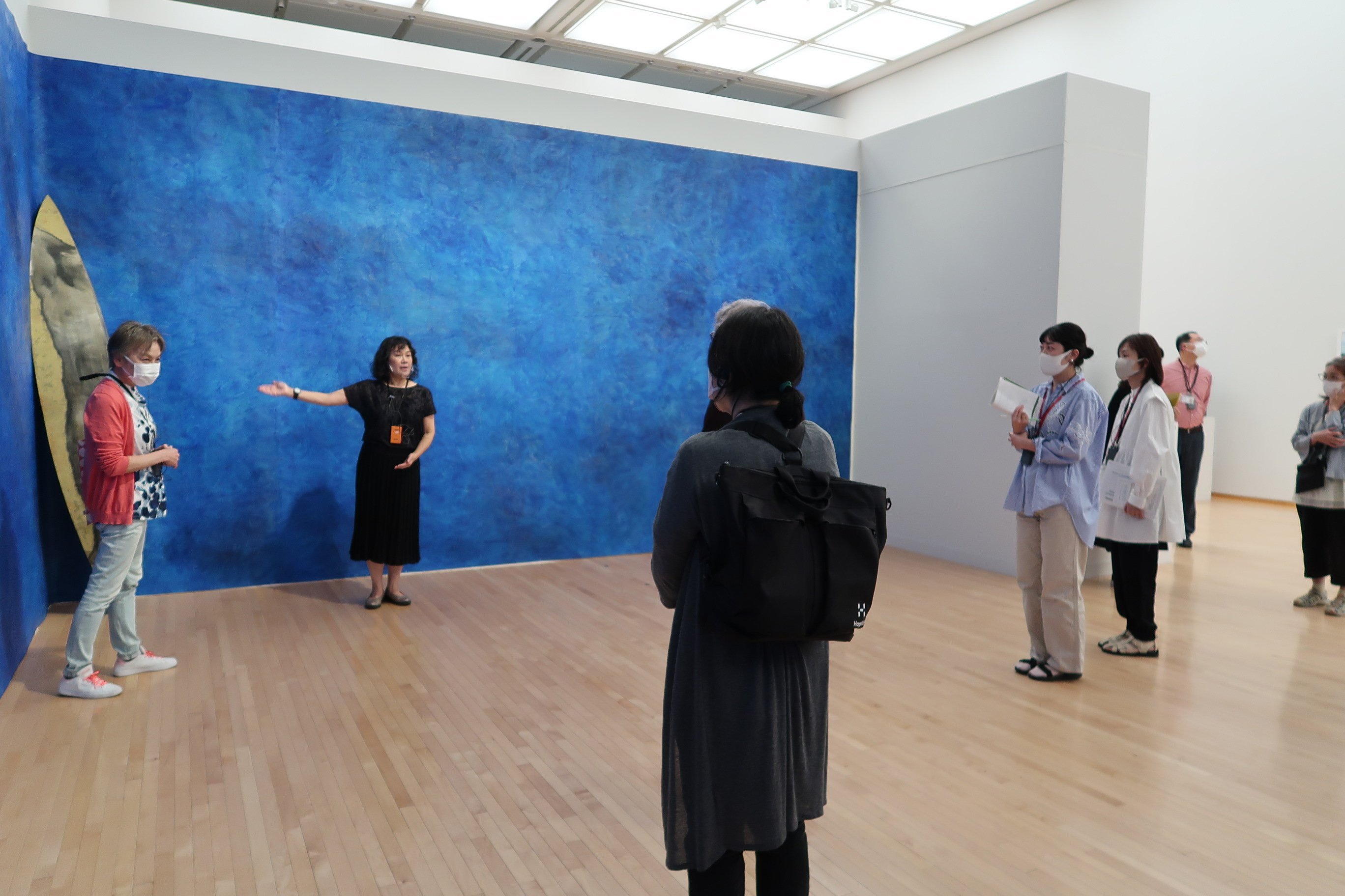 研修室でお話を伺った後は、実際にギャラリートークを行うコレクション展示室に移動して、実際のトークを想定した立ち位置などを確認していきました。