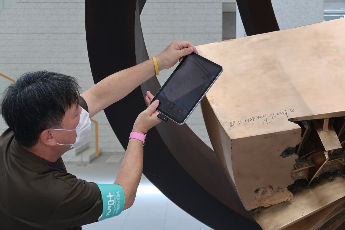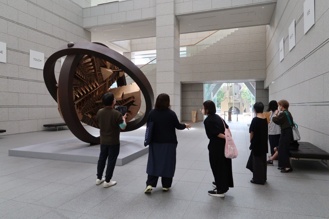 コレクション展示室1Fにあるアルナルド・ポモドーロ《太陽のジャイロスコープ》は、現地組もオンライン組もみんなそろって鑑賞しました。