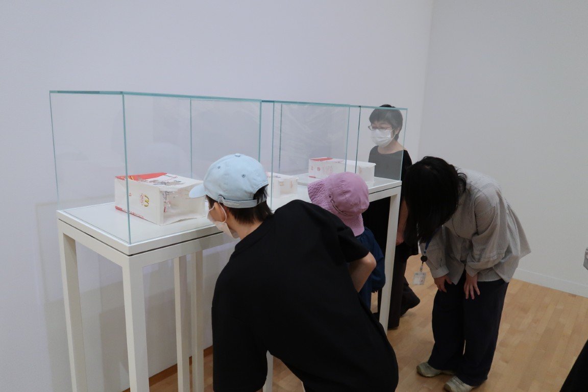 本作は、作品の周囲360度、好きな場所から見ることができます。近づいたり、離れたり、目線の高さを変えたりしながら、発見したことや想像したことを話してもらいました。休憩をはさみつつ鑑賞した後は、対面組とオンライン組に緩やかに分かれ、それぞれのペースを大事にしながら展示室をめぐっていきました。