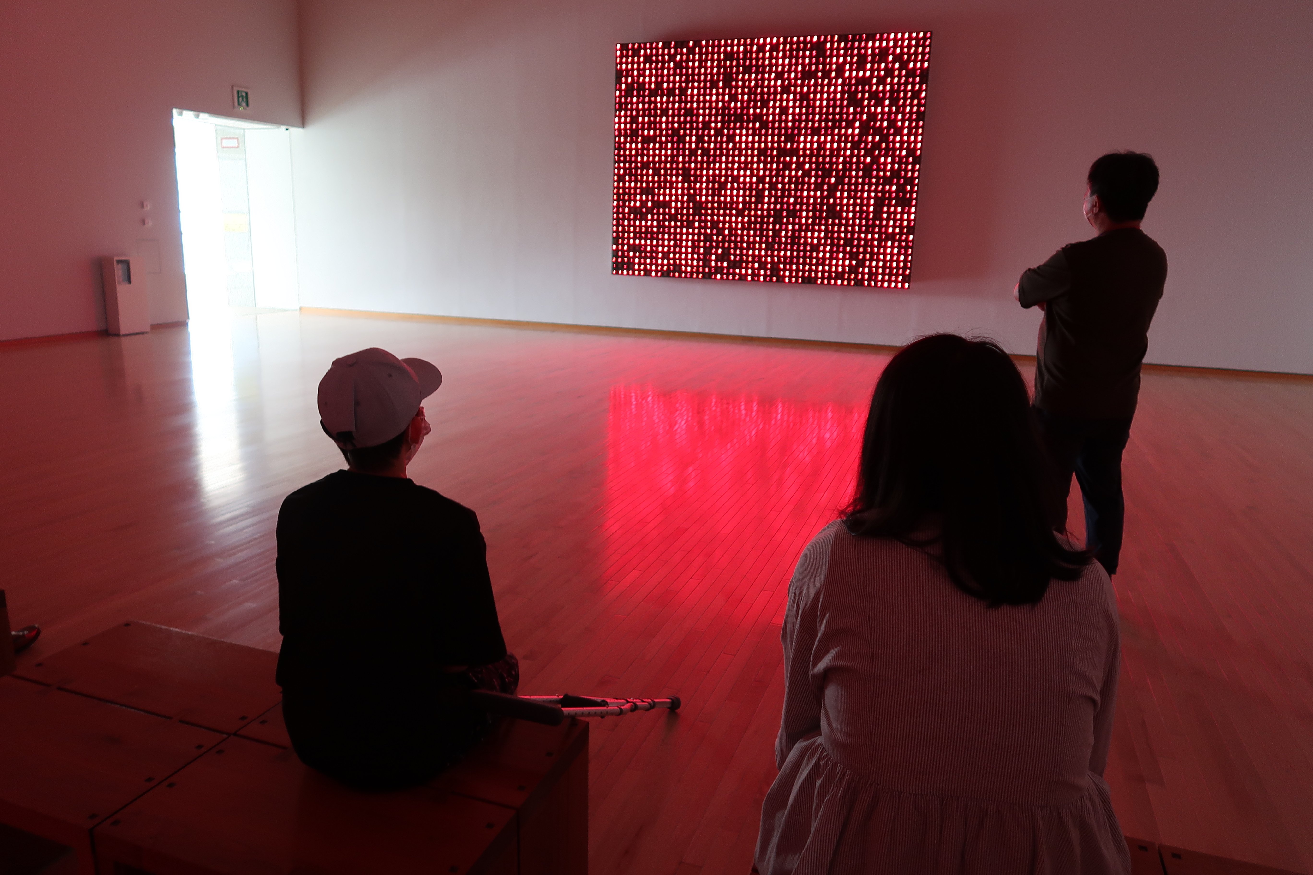 3F最後の展示室では、LEDの1から9までの数字が、それぞれ異なるスピードでカウントが上がっていく宮島達男による作品、《それは変化し続ける それはあらゆるものと関係を結ぶ それは永遠に続く》を鑑賞しました。本作の展示空間に立ち入った際に「この作品知っている!」という声が。