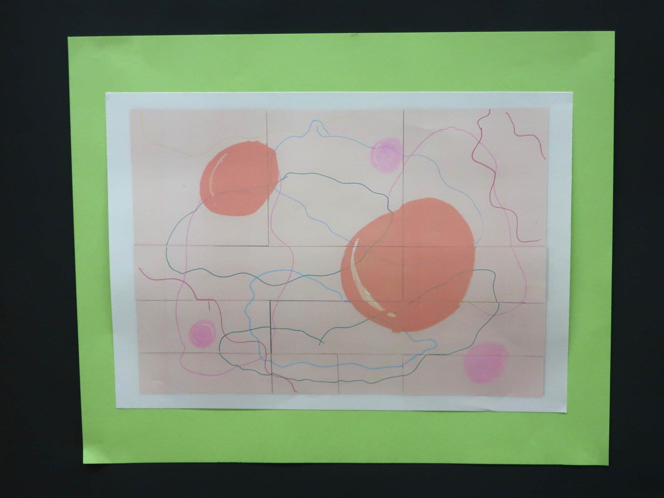 続いて、こちらはオレンジやピンクなど、明るい色が印象的な作品です。描き始める時は、何を描いたら良いかわからなかったけれど、先生から「絵でもいいし、線でも何でもいいんだよ」と声をかけられ、特定のテーマを決めることなく自由に描いた作品だそうです。