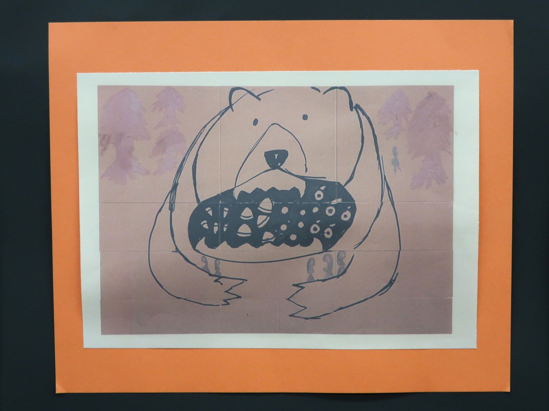 こちらは「大地」から「クマ」を連想し、ボードいっぱいにクマを描いた作品です。さらに、クマから木の実も連想したので、木の実も描いたと教えてくれました。