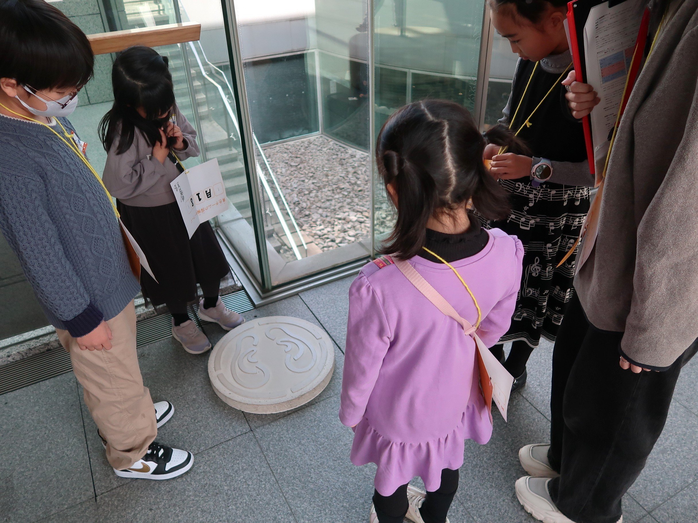 広々としたエントランスを散策中、端の方で不思議な模様が施されている丸型の作品を見つけました。作品に近づいてよく見ると、子どもたちから「足?耳?何の模様?」「どんな作品なんだろう」と声があがります。この作品は、模様の上に立ち周囲の音に耳を傾けることを促すもので、子どもたちも順番に体験することに。廊下にいる人々の声や、近くにあるエスカレーターの音、どこかで鳴いている鳥の声などが聞こえたようです。