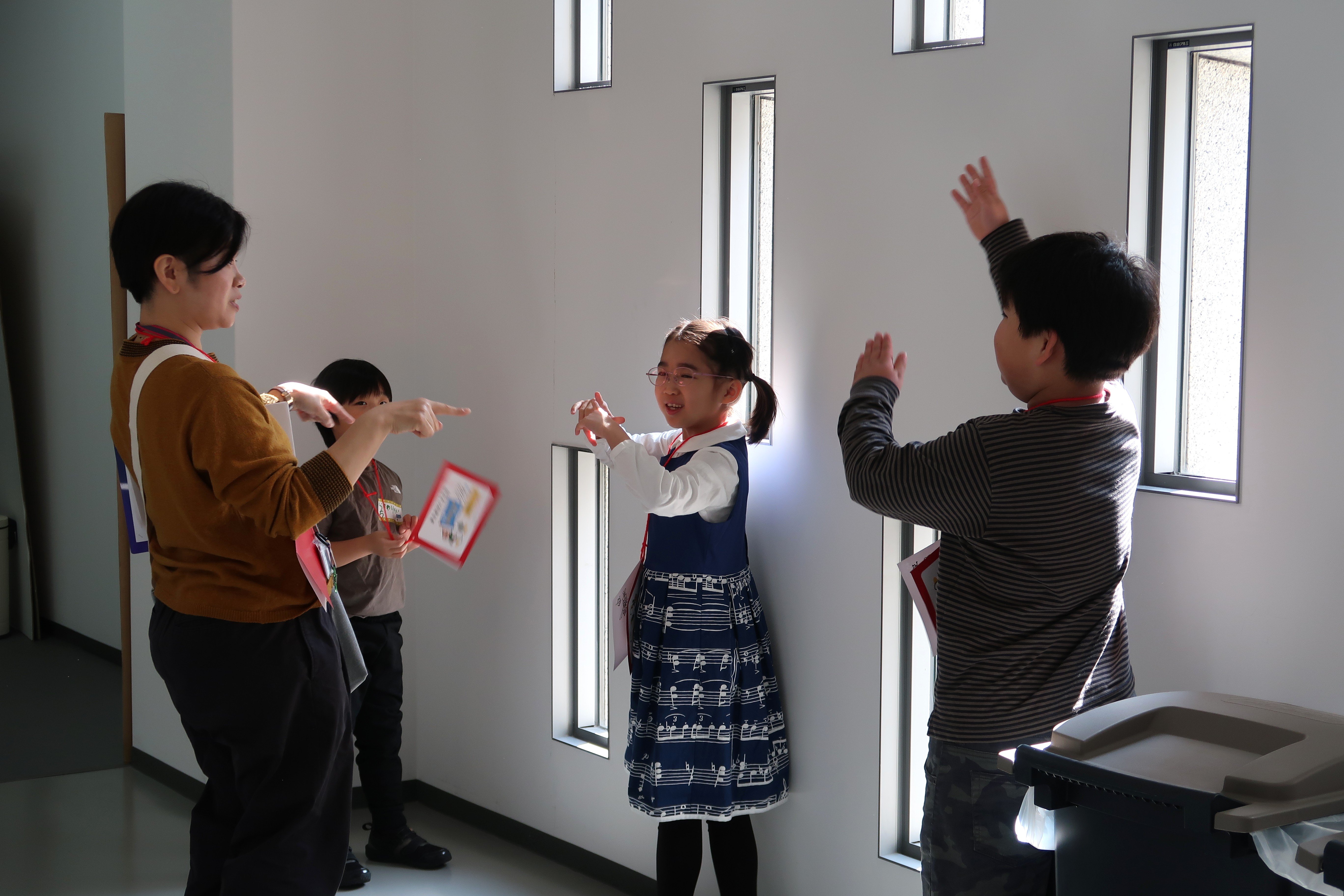 こちらのチームは地下2階のバックヤードの長い廊下を歩いている途中に、小さな窓がたくさん並んでいる場所を見つけたようです。窓の外を見ると「向こうに橋が見える」と1階のエントランスを指し示したり「三角や丸などの形が見える」「コンクリートの石がある」と見つけたものを共有しあっていました。