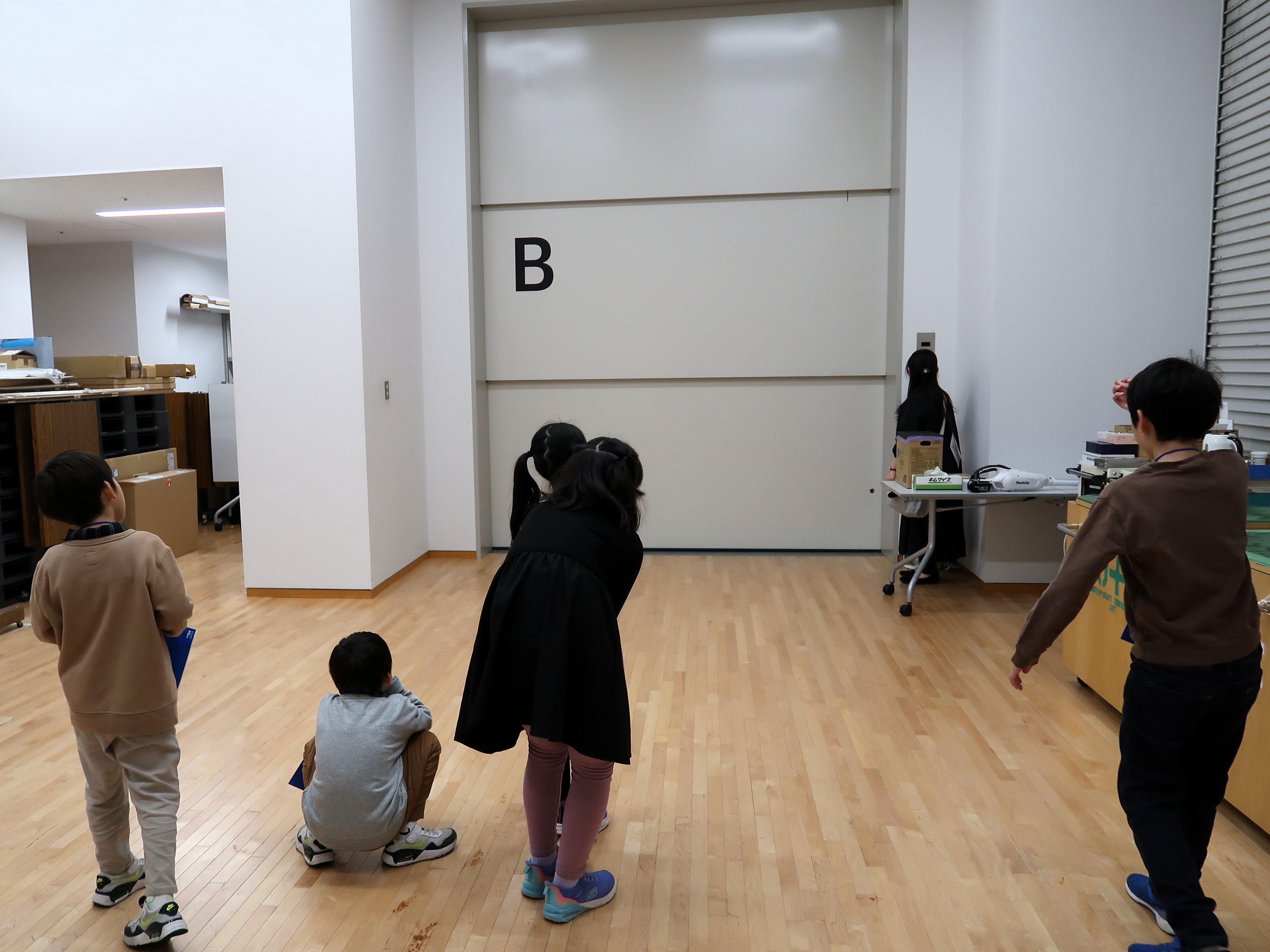 見つけたボタンをリーダーが押すと、壁が徐々に上っていき目の前には広い空間が現れました。これは作品を搬入するための大きなエレベーターでした。今回は特別に、このエレベーターに乗って移動することができました。リーダーからの“作品を搬入する”という言葉を受けて作品になりきって乗る子どもたちもいました。