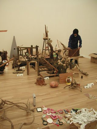 金氏さん。流木、板、棒、色んな木がどんどん作品に。
