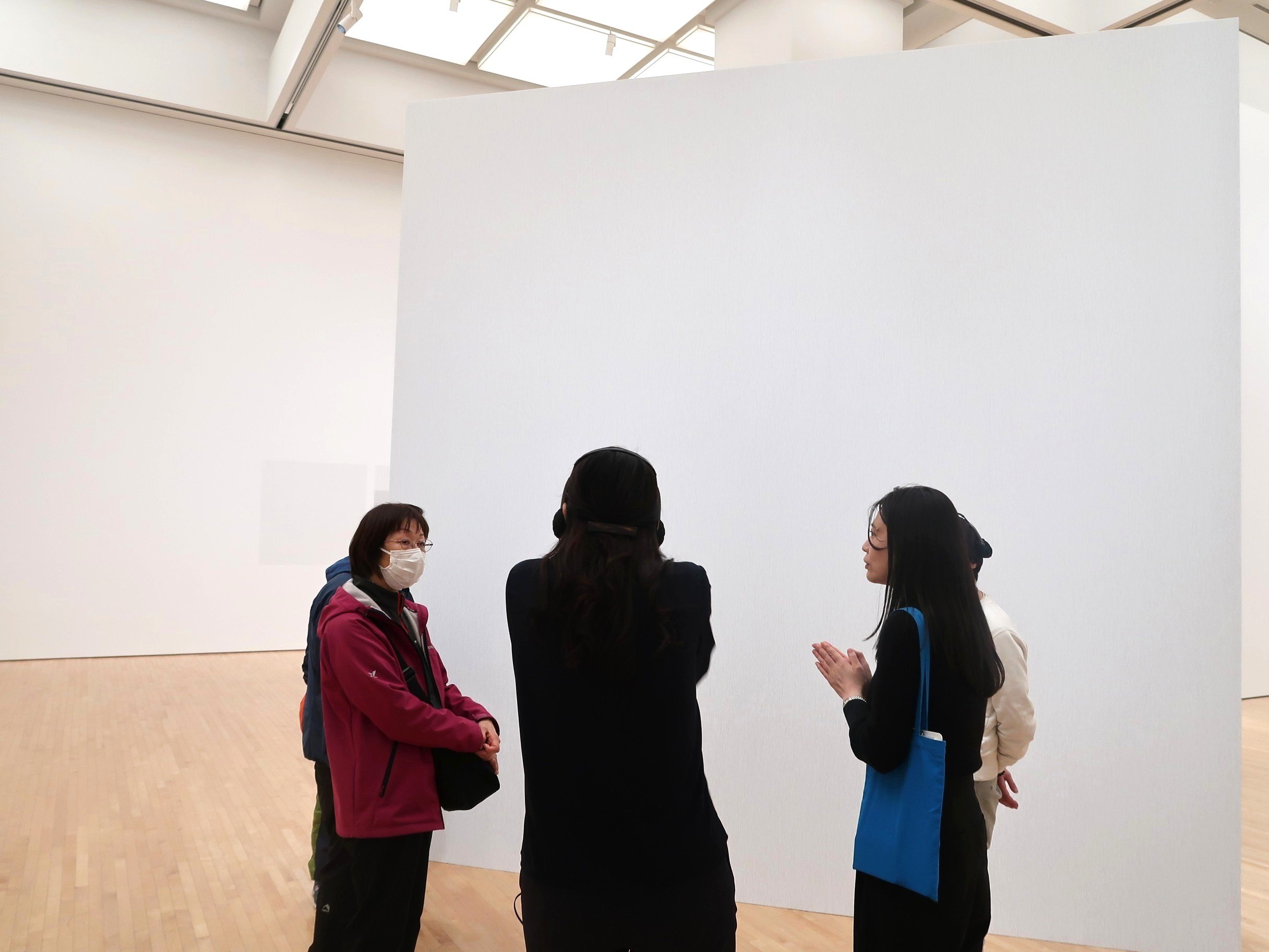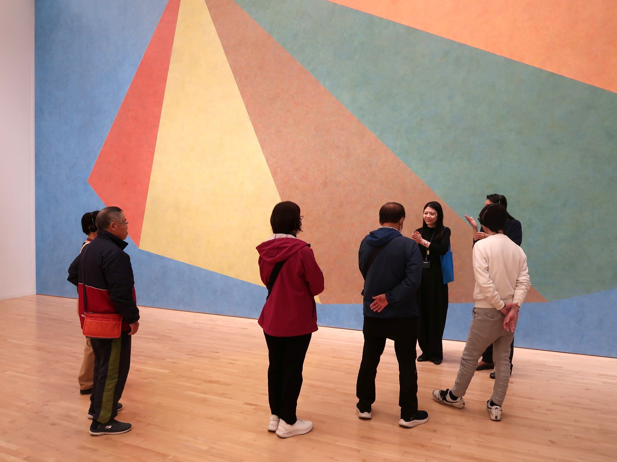 この作品は、展示されている他の作品と比べて、鮮やかな色で構成されています。青い背景の上に、それぞれ異なる色で塗られた三角形が5つ並んでいるので、多くの色を使っているように見えるかもしれません。しかし、実際に使われているのは青・赤・黄・グレーの計4色です。「これらの色を使い、どのように三角形が描かれたと思いますか?」と学芸員が参加者に尋ねると「混ぜ合わせた色を壁に塗った」「実は粘土が使われているのでは?」「水に染料を溶いて塗った」など様々な意見があがり、その場の全員で会話を楽しむ様子が見受けられました。その後、学芸員から、壁面で一色ずつ塗り重ねて制作されたことが明かされると、参加者は壁面をじっくりと観察し、色の重なりを味わっていました。