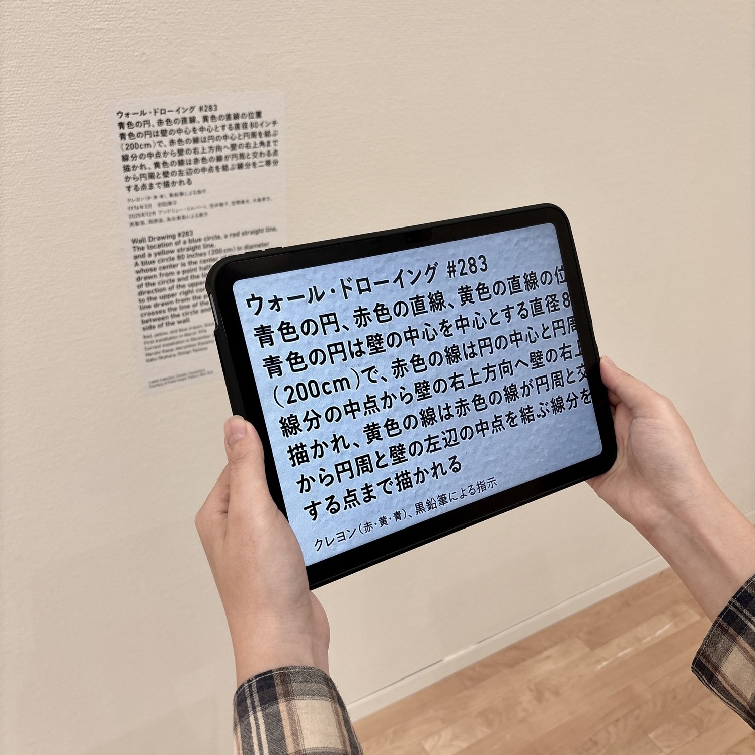 The exhibition provides the artwork title in Braille along with tactile images for Wall Drawing #283 The location of a blue circle, a red straight line and a yellow straight line.