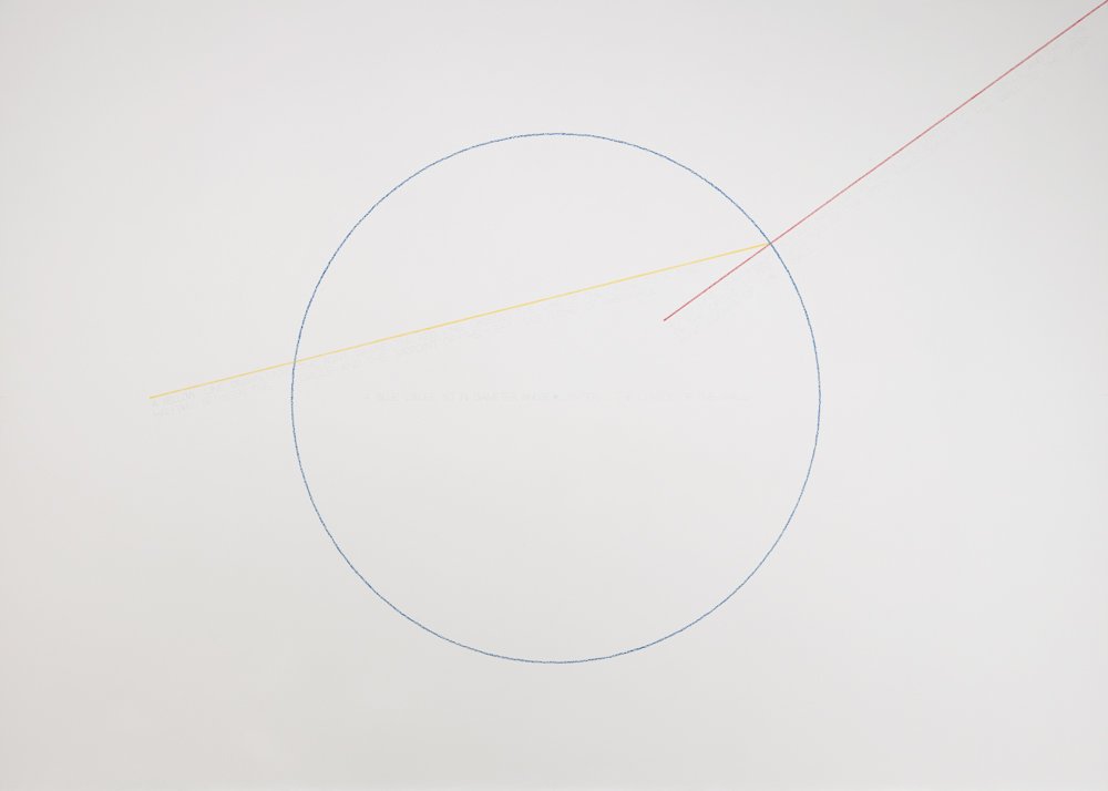 Sol LeWitt, Wall Drawing #283 The location of a blue circle, a red straight line and a yellow straight line, first installation: 1976. Installation view at Yale University Art Gallery West Campus Collections Center, West Haven, Connecticut, 2017. © 2025 The LeWitt Estate / Artists Rights Society (ARS), New York. Courtesy Paula Cooper Gallery.