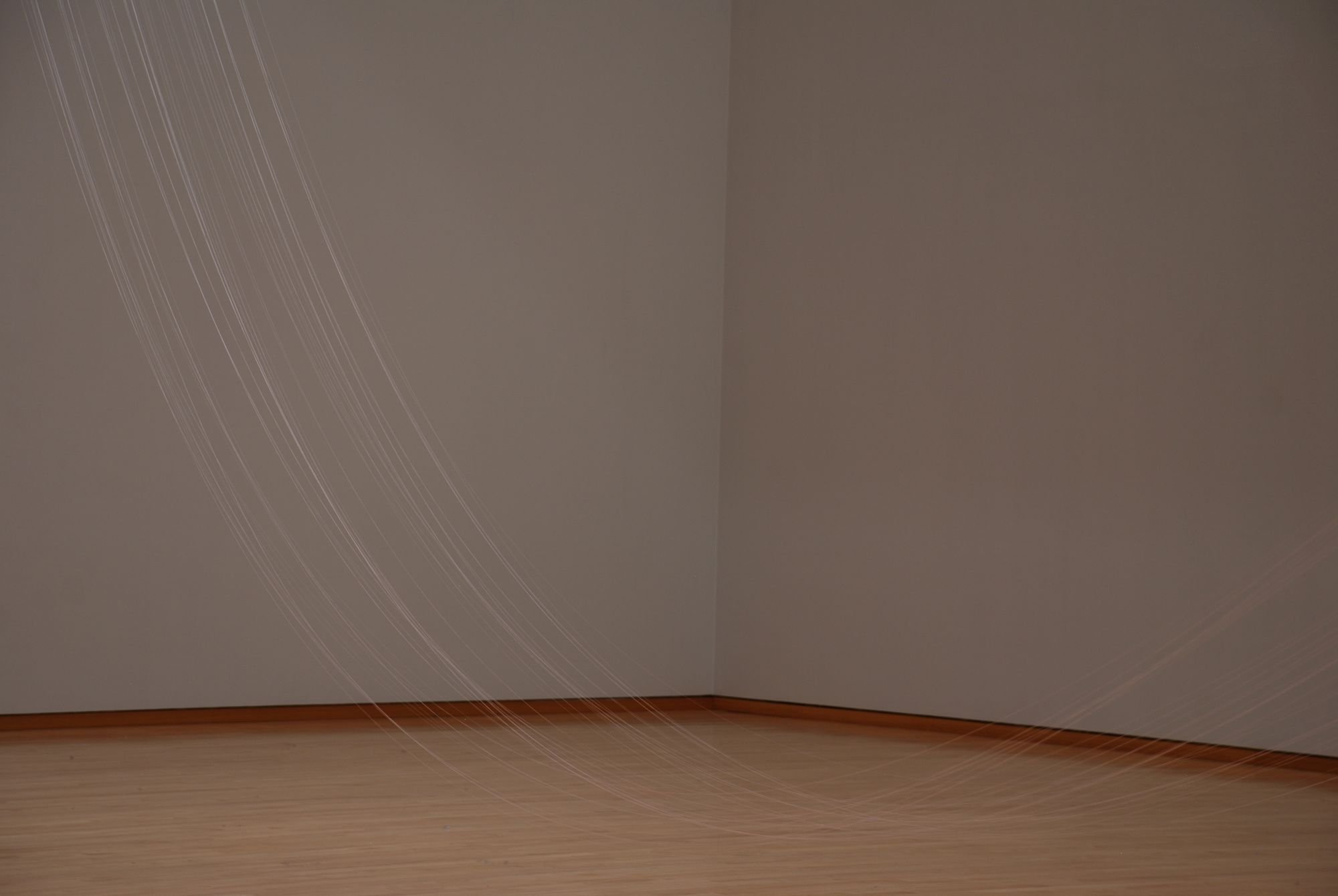 MOTコレクション「中西夏之 池内晶子 —弓形とカテナリー」で展示中の池内晶子による作品《Knotted Thread -sakura-pink -81knots -north-northeast - south-southwest -catenary -h.645cm (結ばれた糸、桜色、81の結び目、北北東ー南南西、懸垂線、高さ645cm)》に手を加え、かたちを変える公開制作を行います。